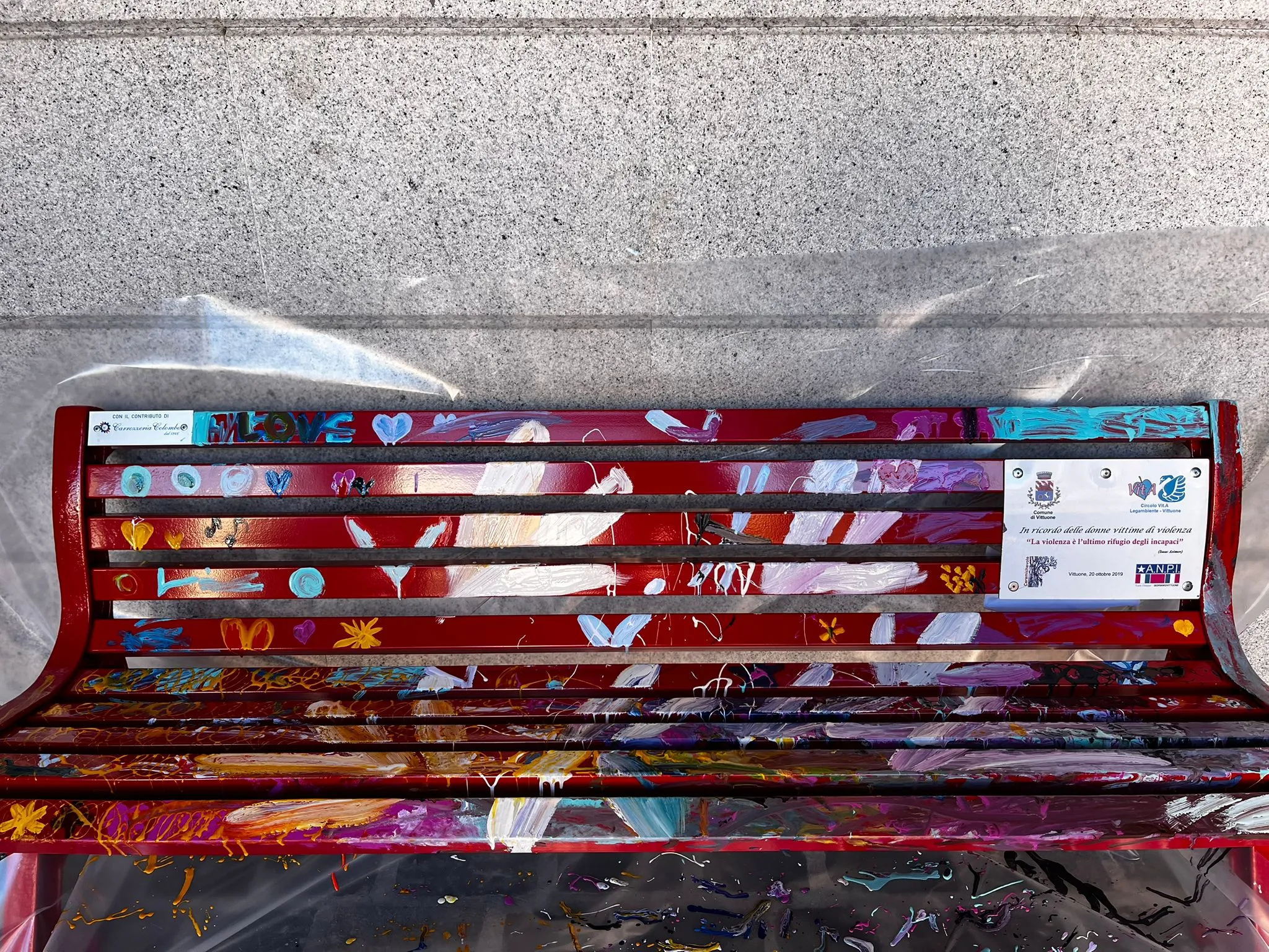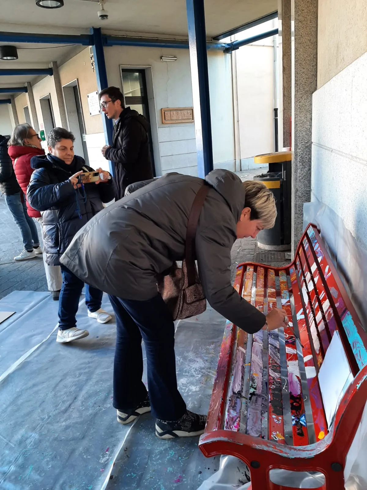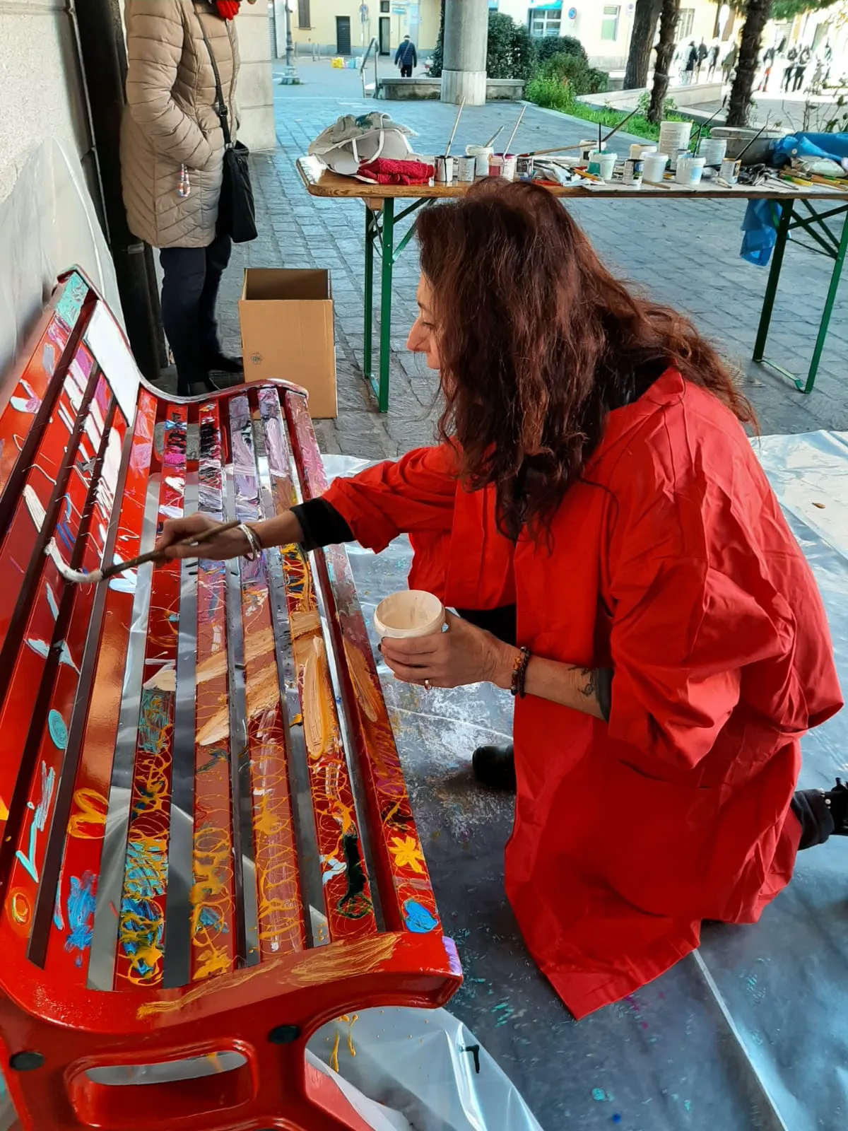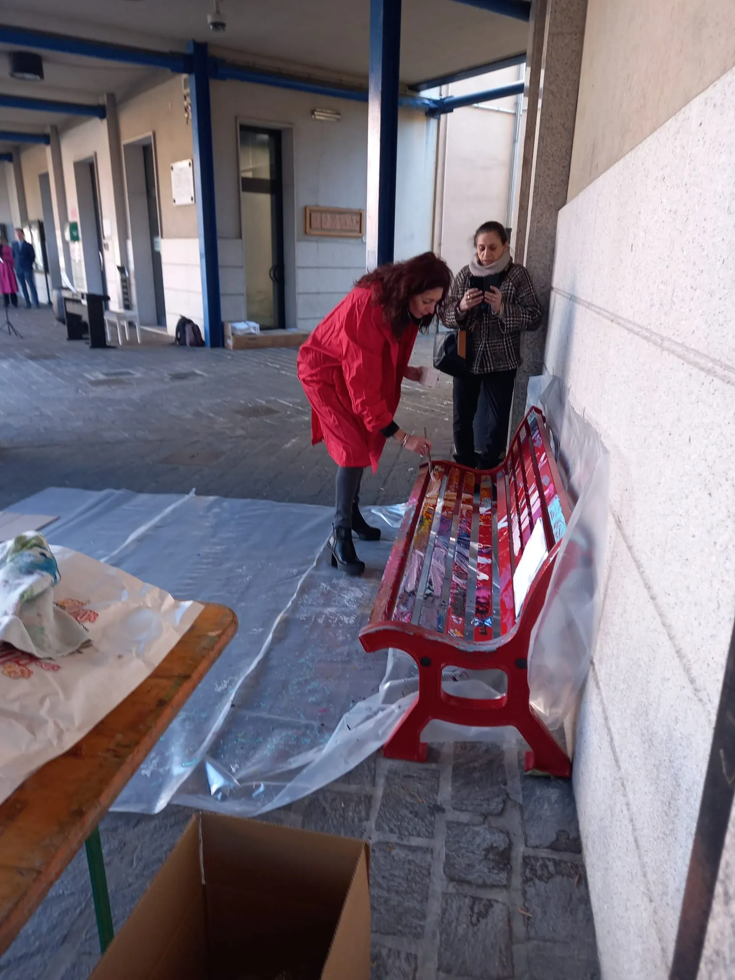 Panchina rossa dipinta a mano in piazza contro la violenza sulle donne, un simbolo di rispetto e speranza per un futuro senza paura.