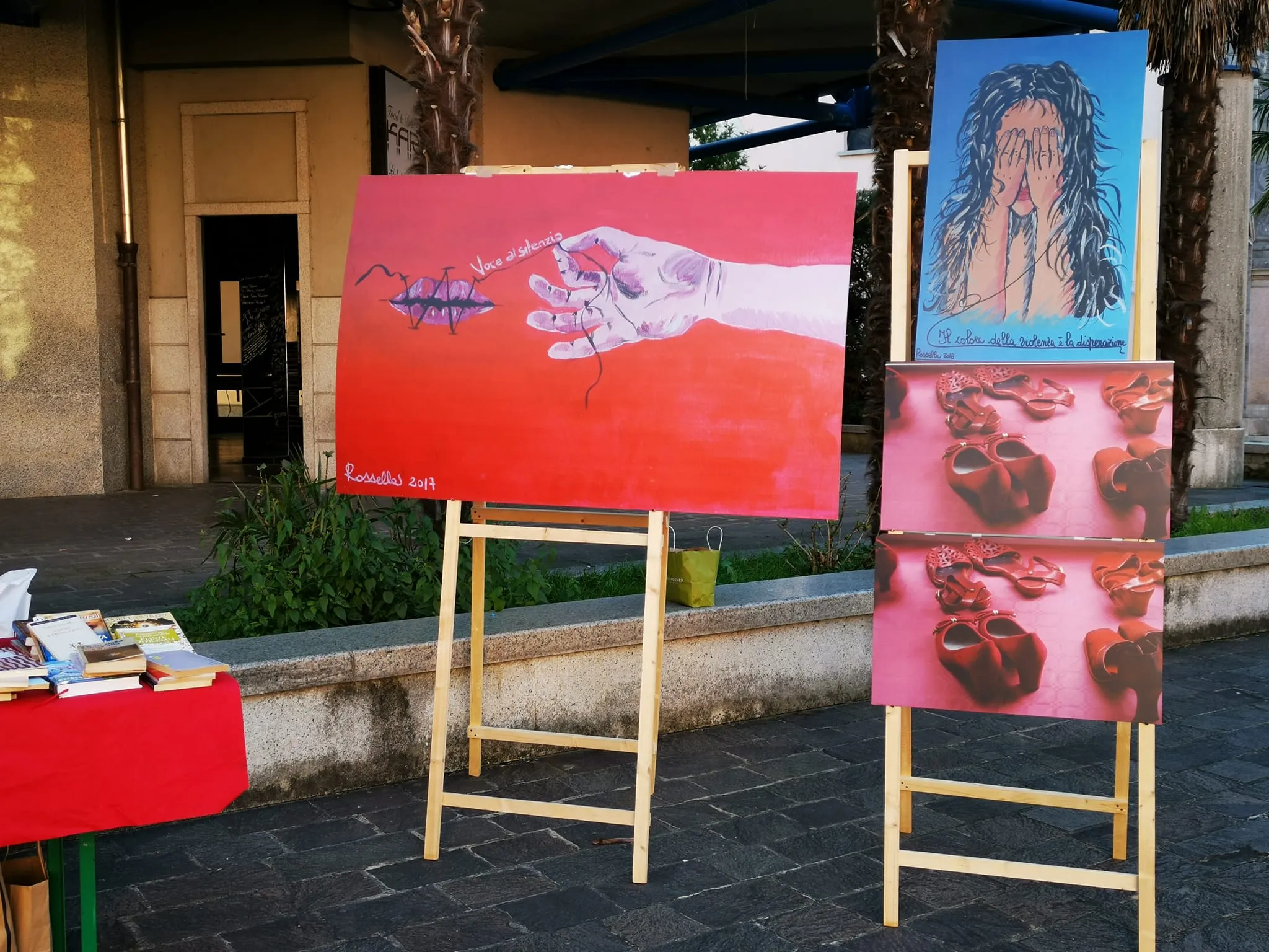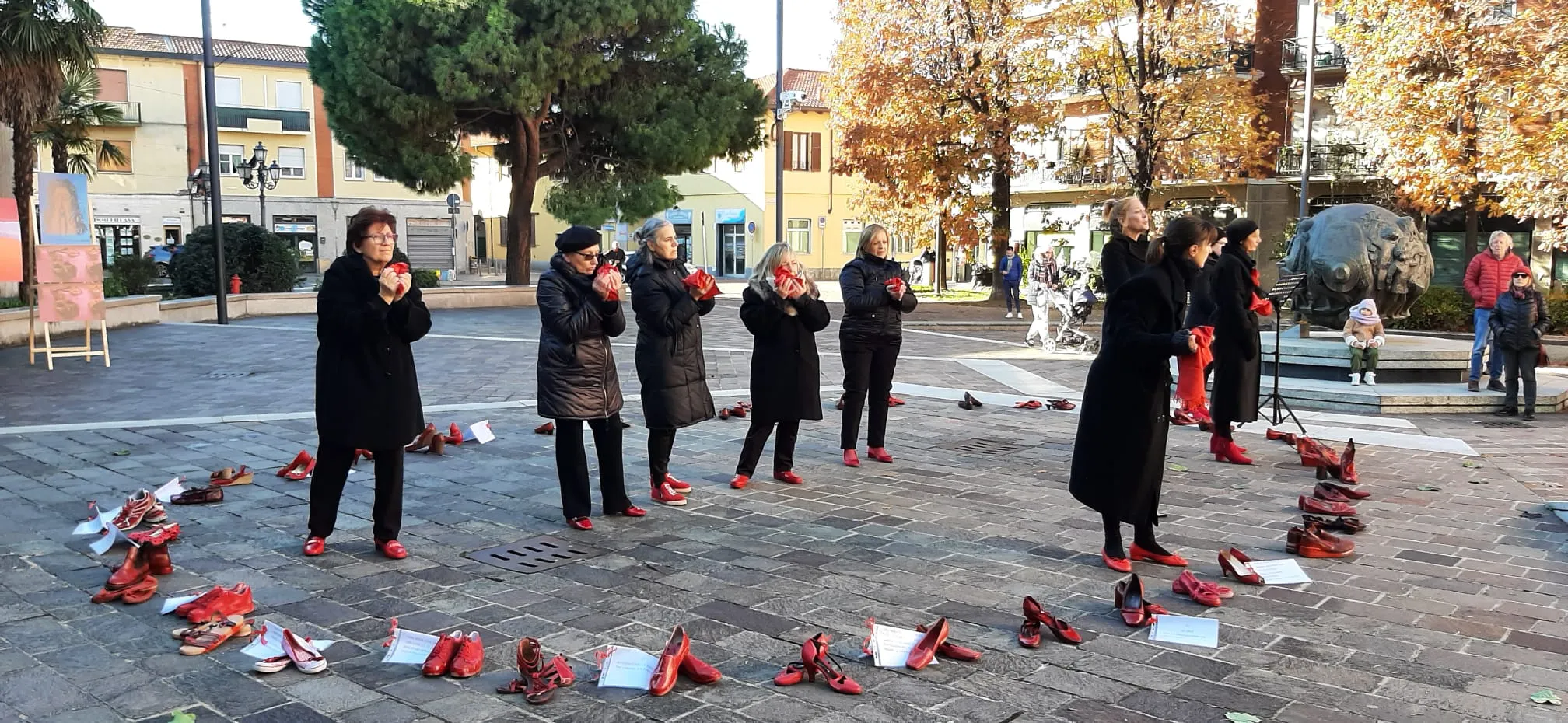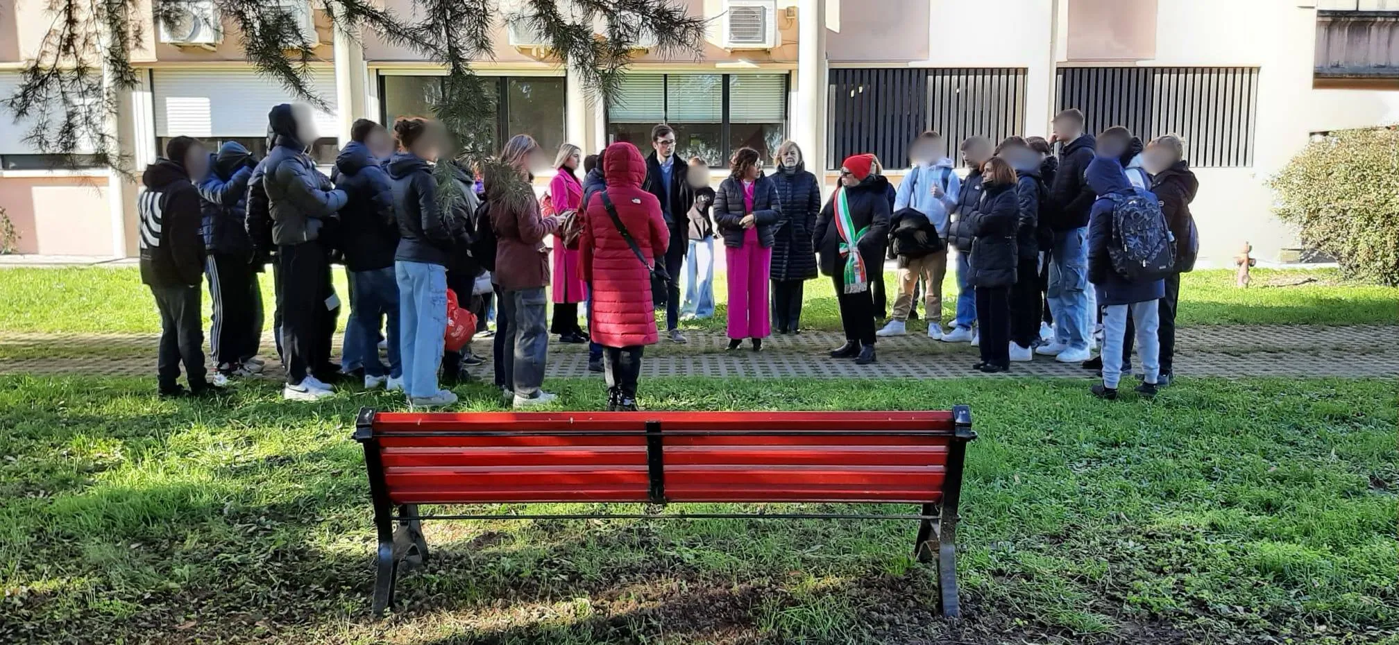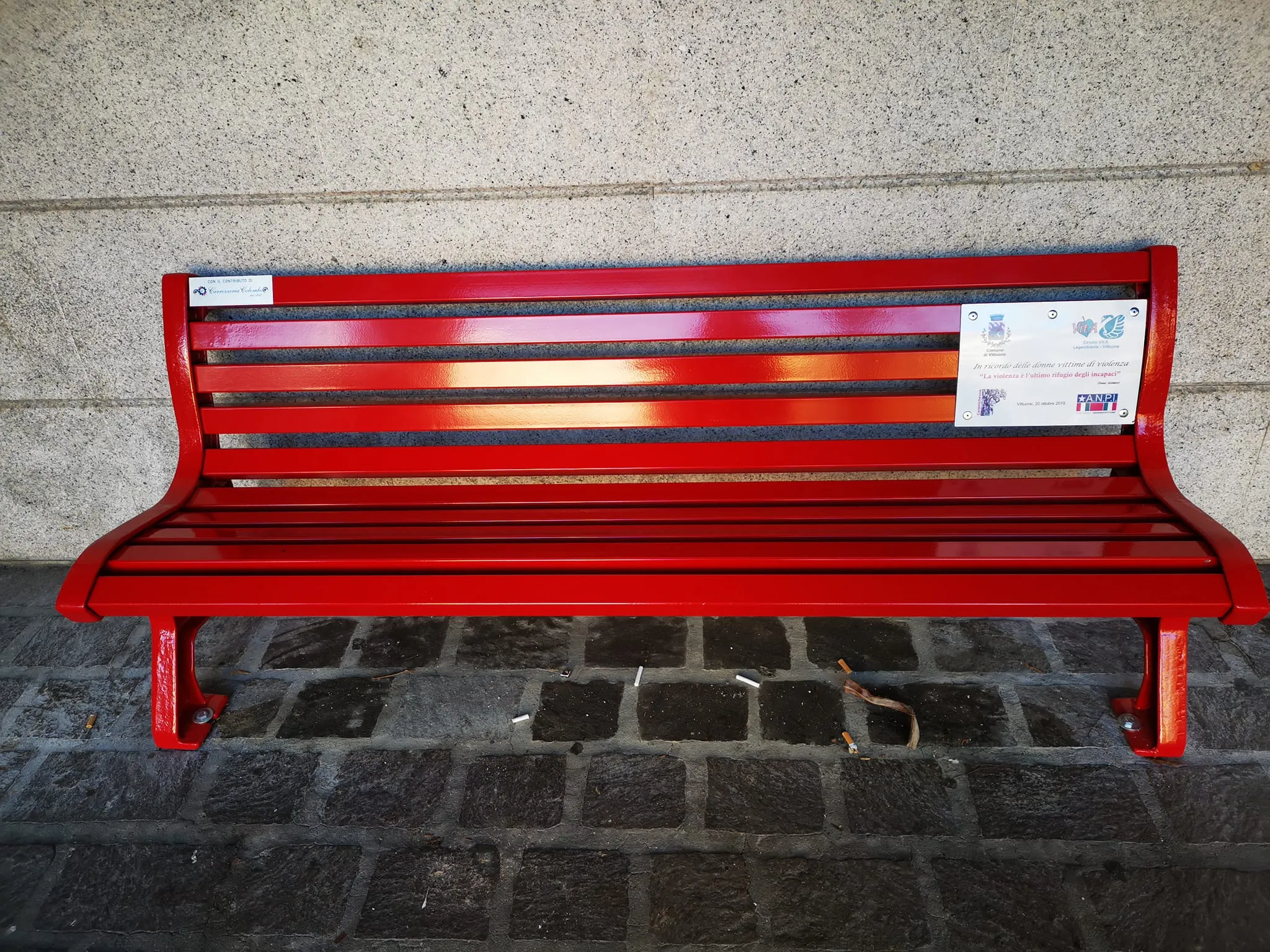 Panchina rossa dipinta a mano in piazza contro la violenza sulle donne, un simbolo di rispetto e speranza per un futuro senza paura.