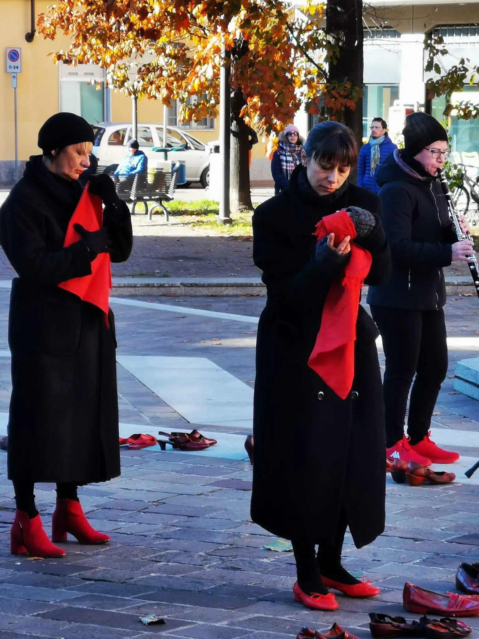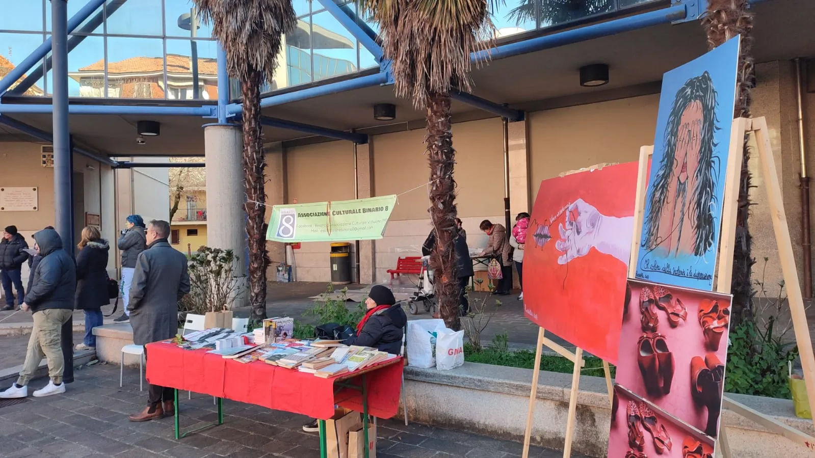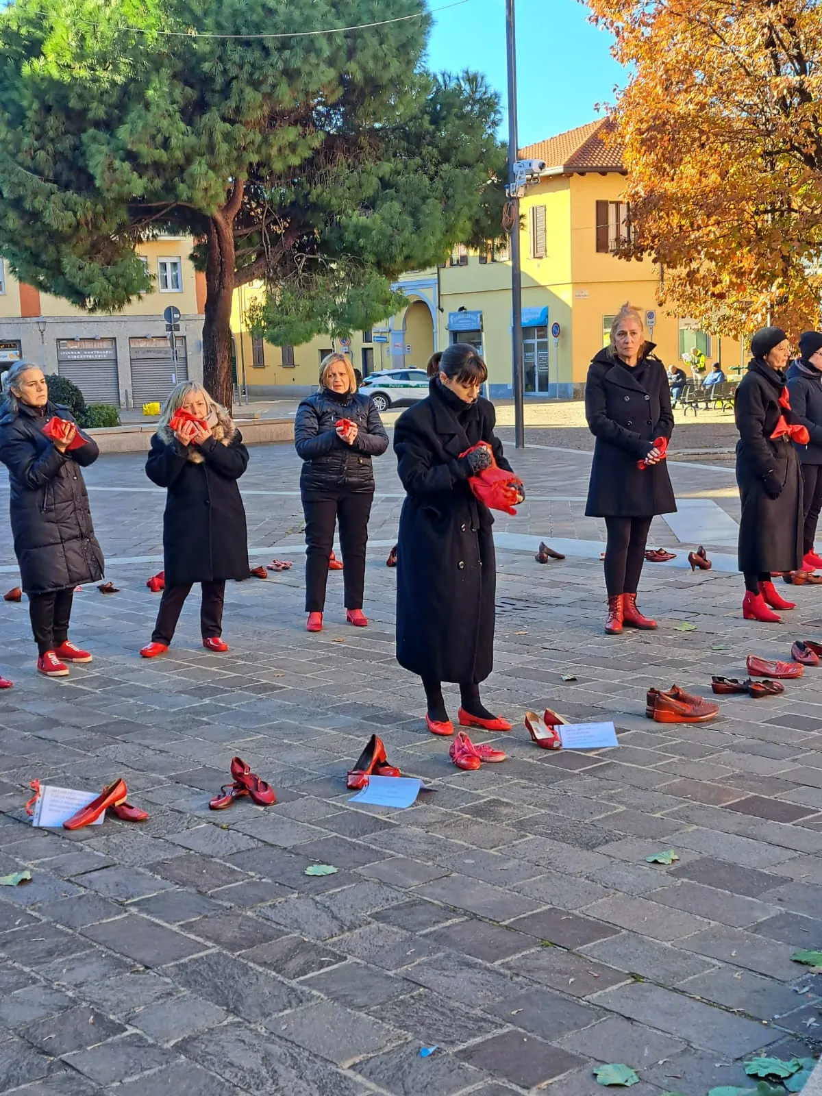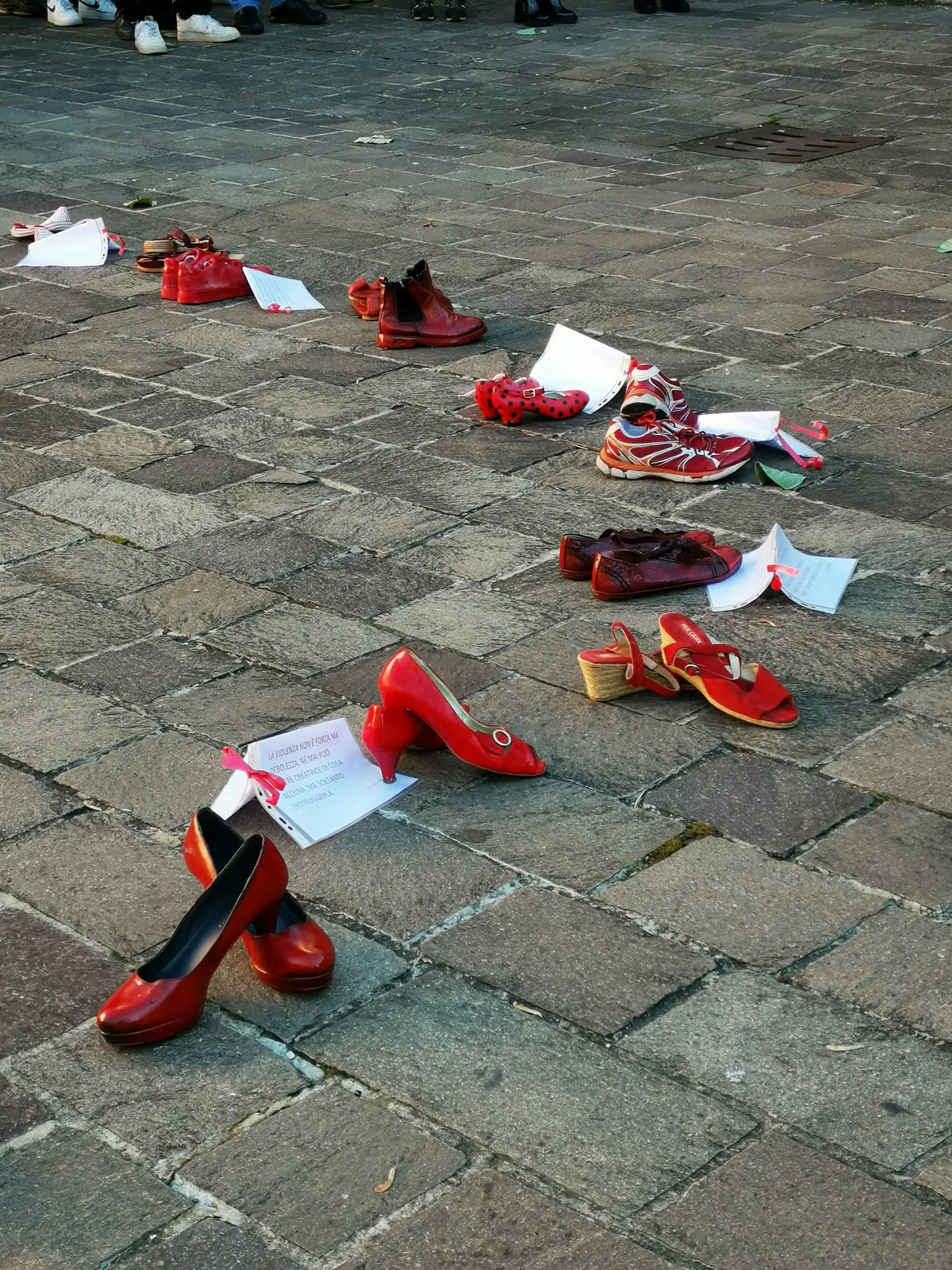 Panchina rossa dipinta a mano in piazza contro la violenza sulle donne, un simbolo di rispetto e speranza per un futuro senza paura.