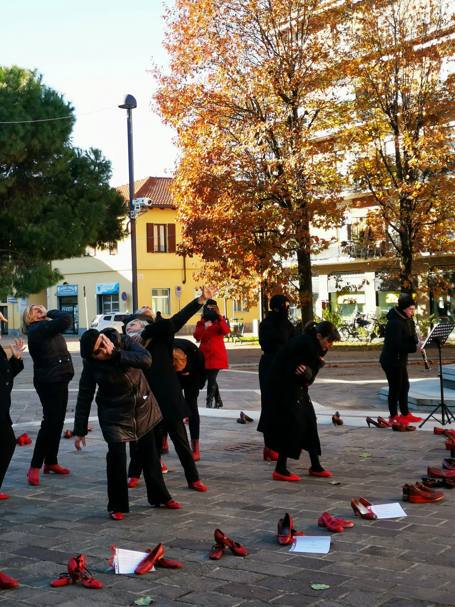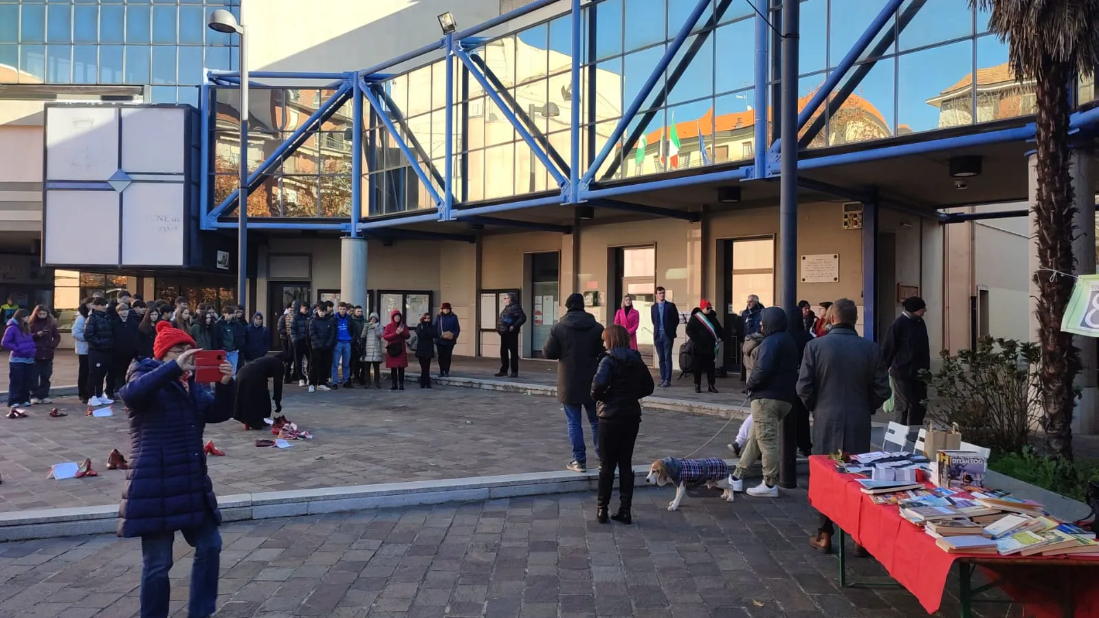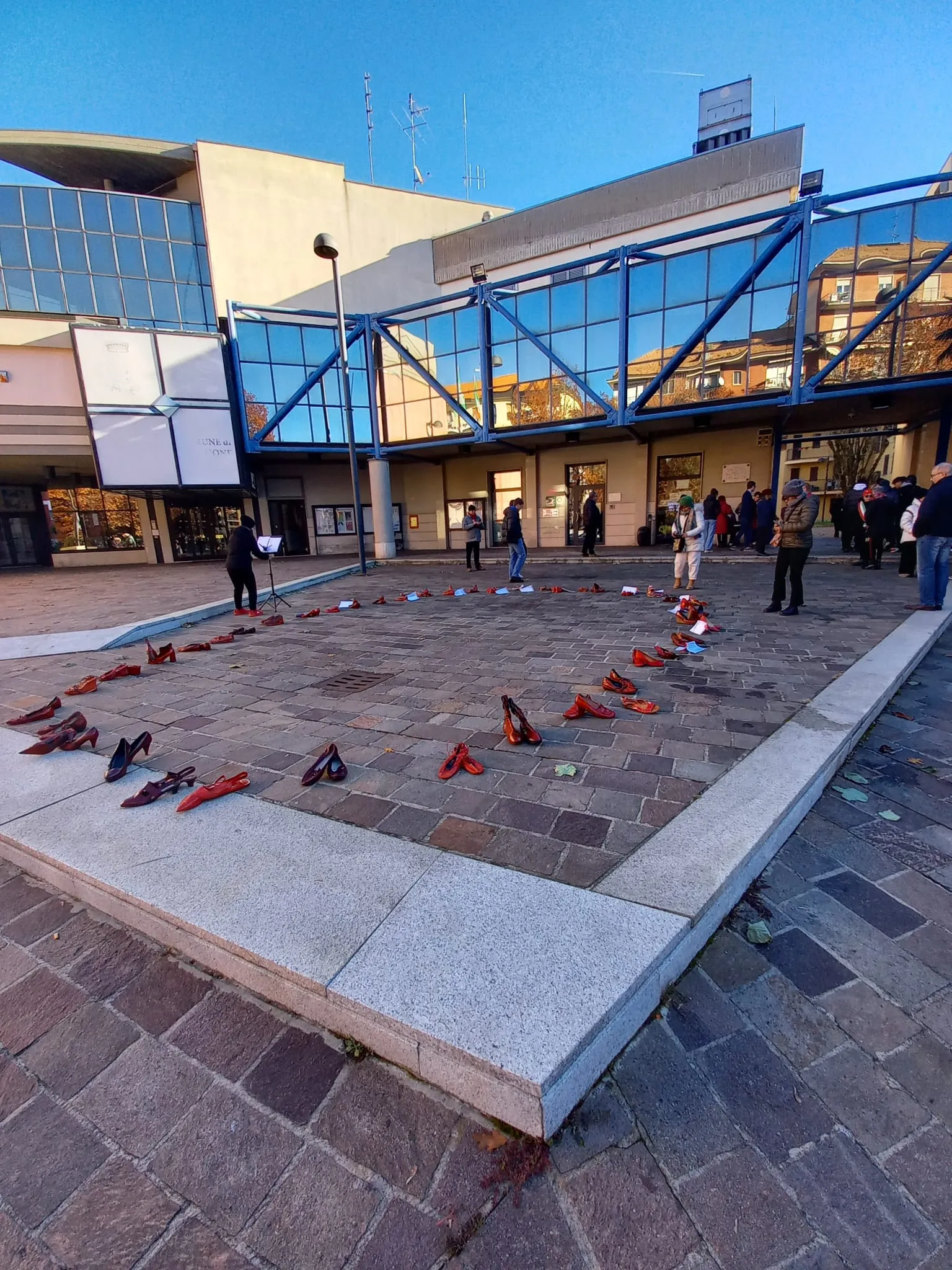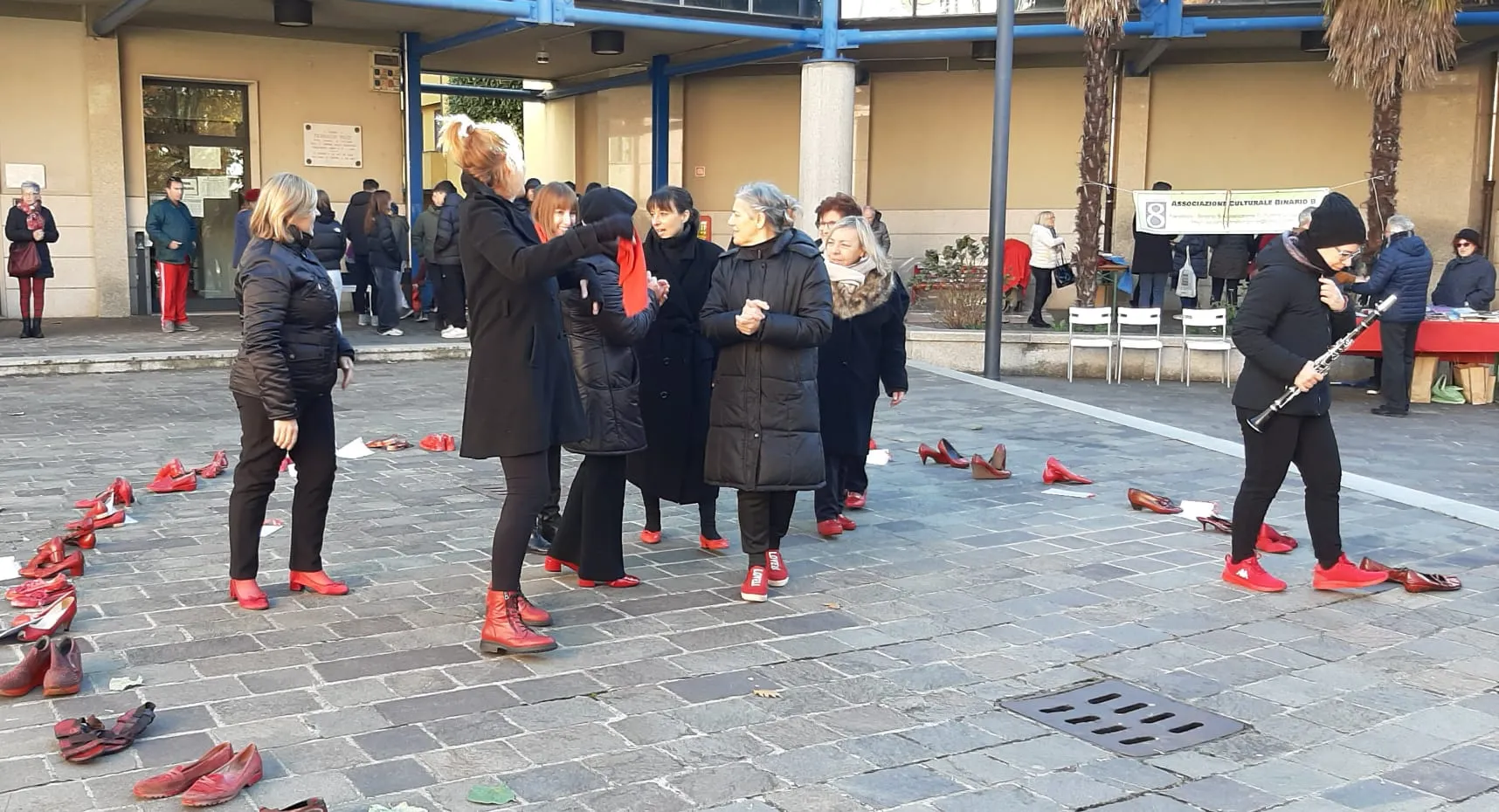 Panchina rossa dipinta a mano in piazza contro la violenza sulle donne, un simbolo di rispetto e speranza per un futuro senza paura.