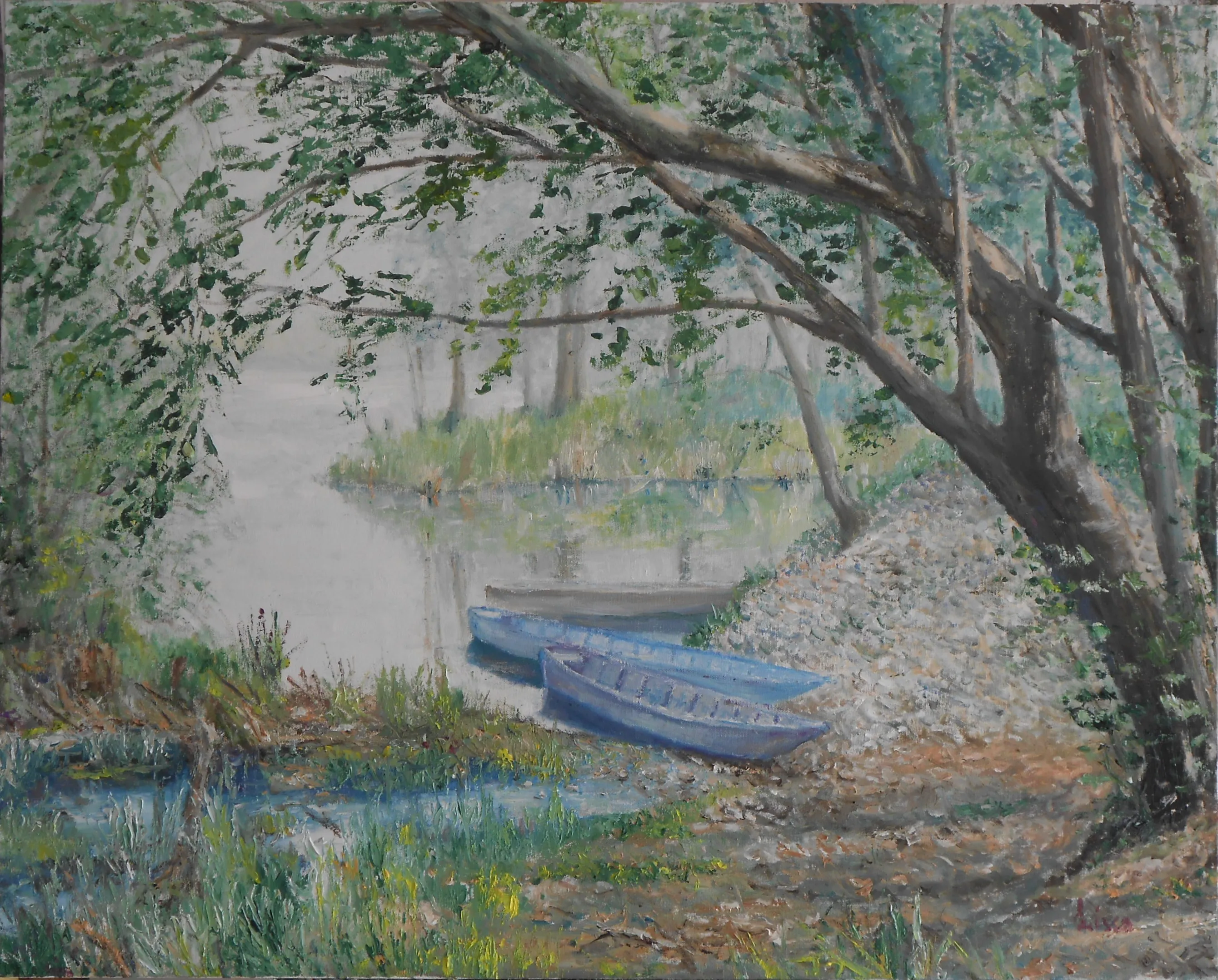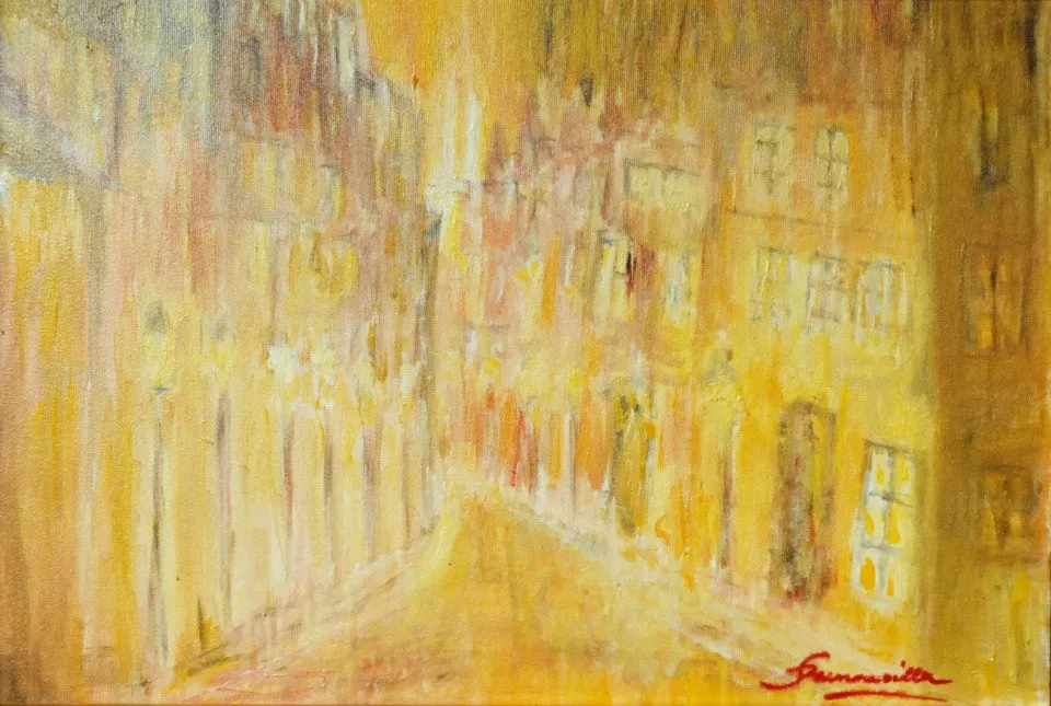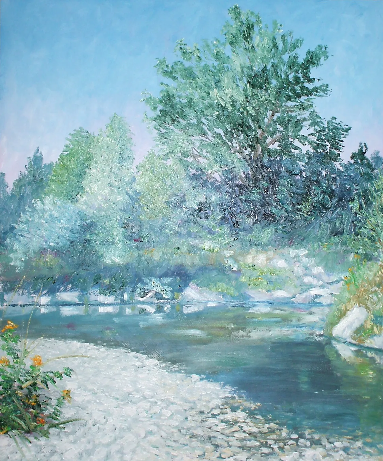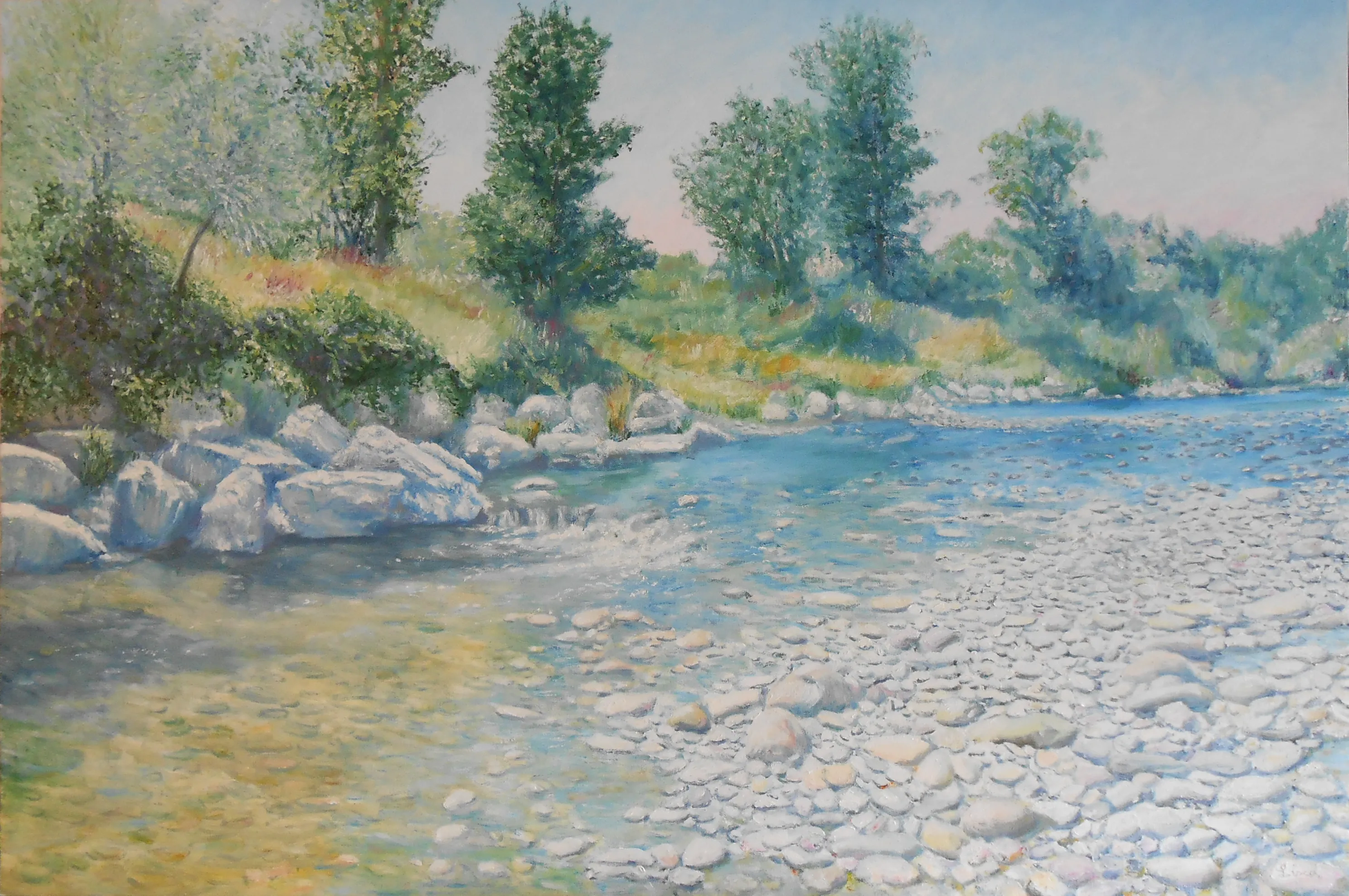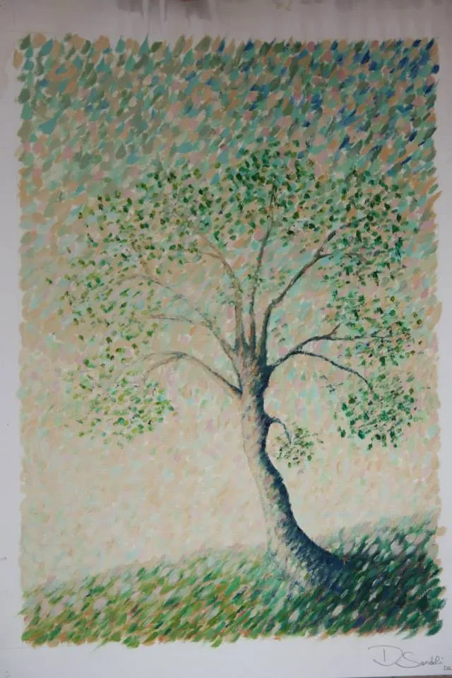 L’artista osserva la luce con curiosità e interesse, scomponendola nei suoi colori. Dipinge senza mescolare, creando superfici vive e sensazioni visive con una tecnica rapida e spontanea.
