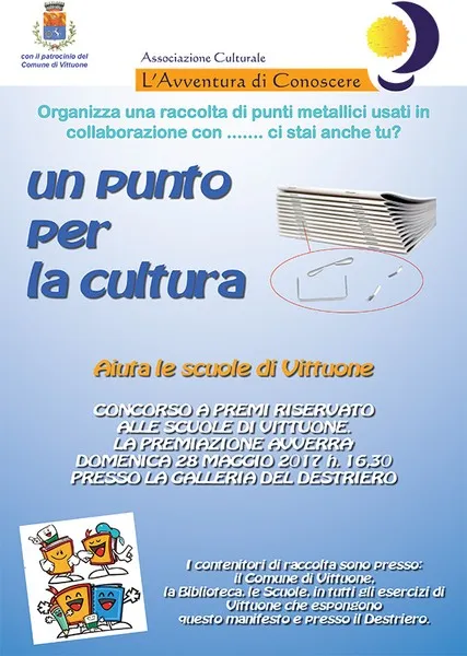 La nostra Associazione, con il patrocinio del Comune di Vittuone, organizza un concorso di raccolta punti metallici per le scuole locali, per finanziare materiali di consumo. Alla fine, i contenitori saranno pesati e l’istituto con più punti vincerà un premio. Il Comune sarà giudice unico.