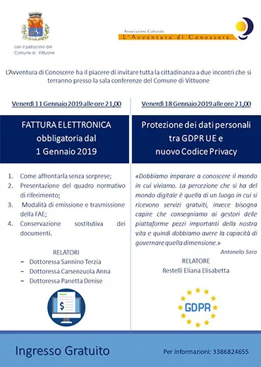 L'Avventura di Conoscere ha organizzato una serata per approfondire il tema della fatturazione elettronica e informare i partecipanti sulle nuove norme relative al trattamento dei dati personali.