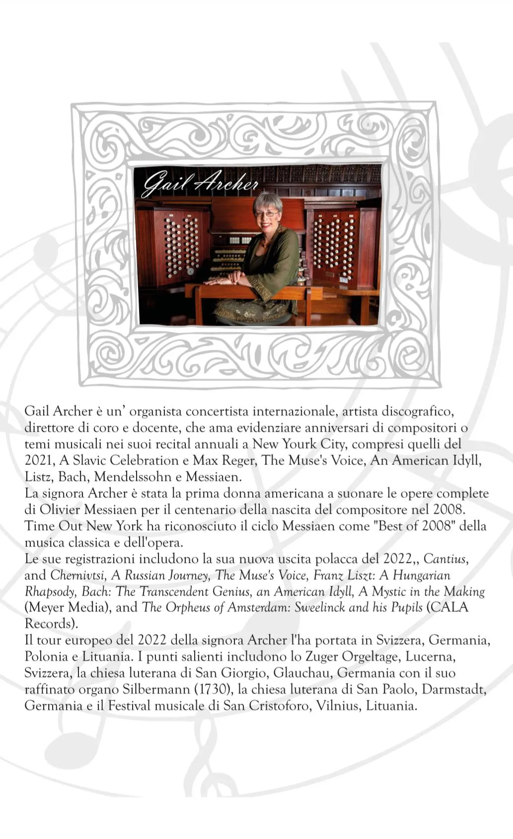Gail Archer è un’organista concertista, nota per recital tematici a New York. Prima donna americana a suonare l’opera completa di Messiaen nel 2008, ha ricevuto riconoscimenti da Time Out New York. Ha inciso numerosi album e si è esibita in prestigiosi festival e chiese storiche.