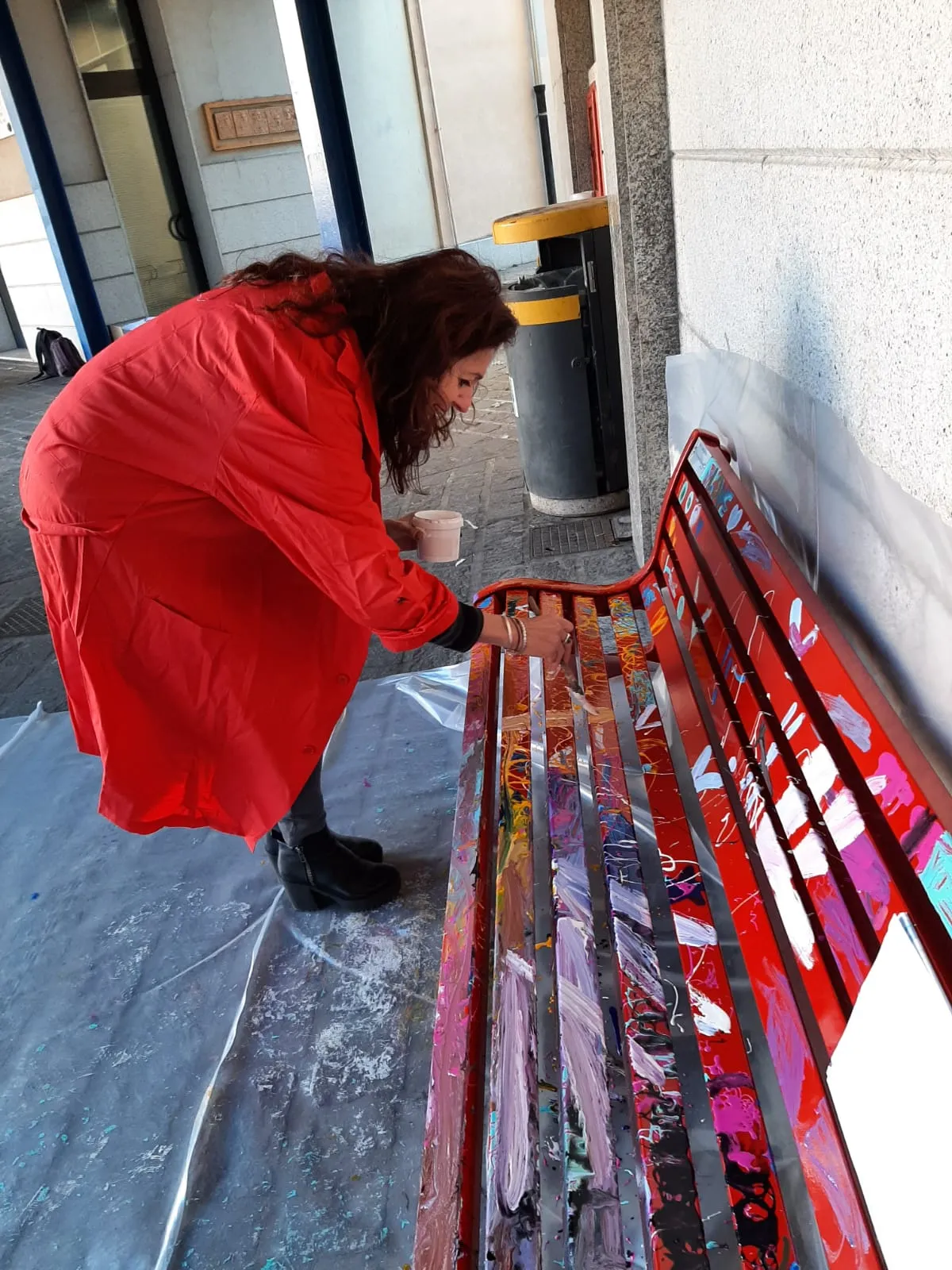Panchina rossa dipinta a mano in piazza contro la violenza sulle donne, un simbolo di rispetto e speranza per un futuro senza paura.